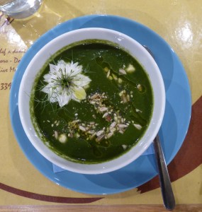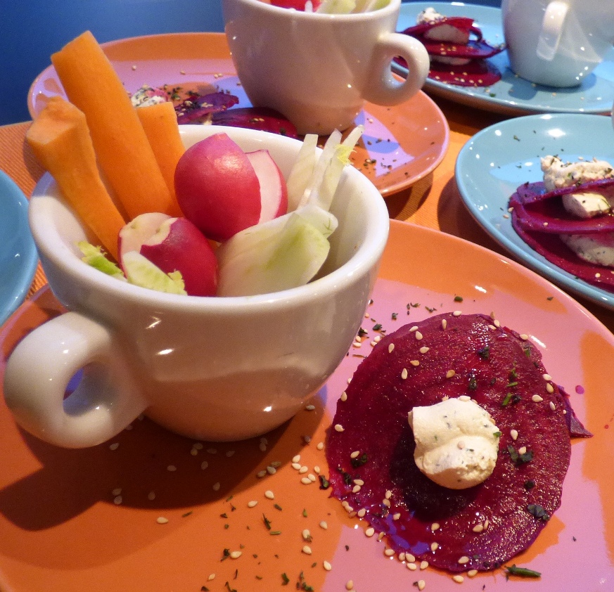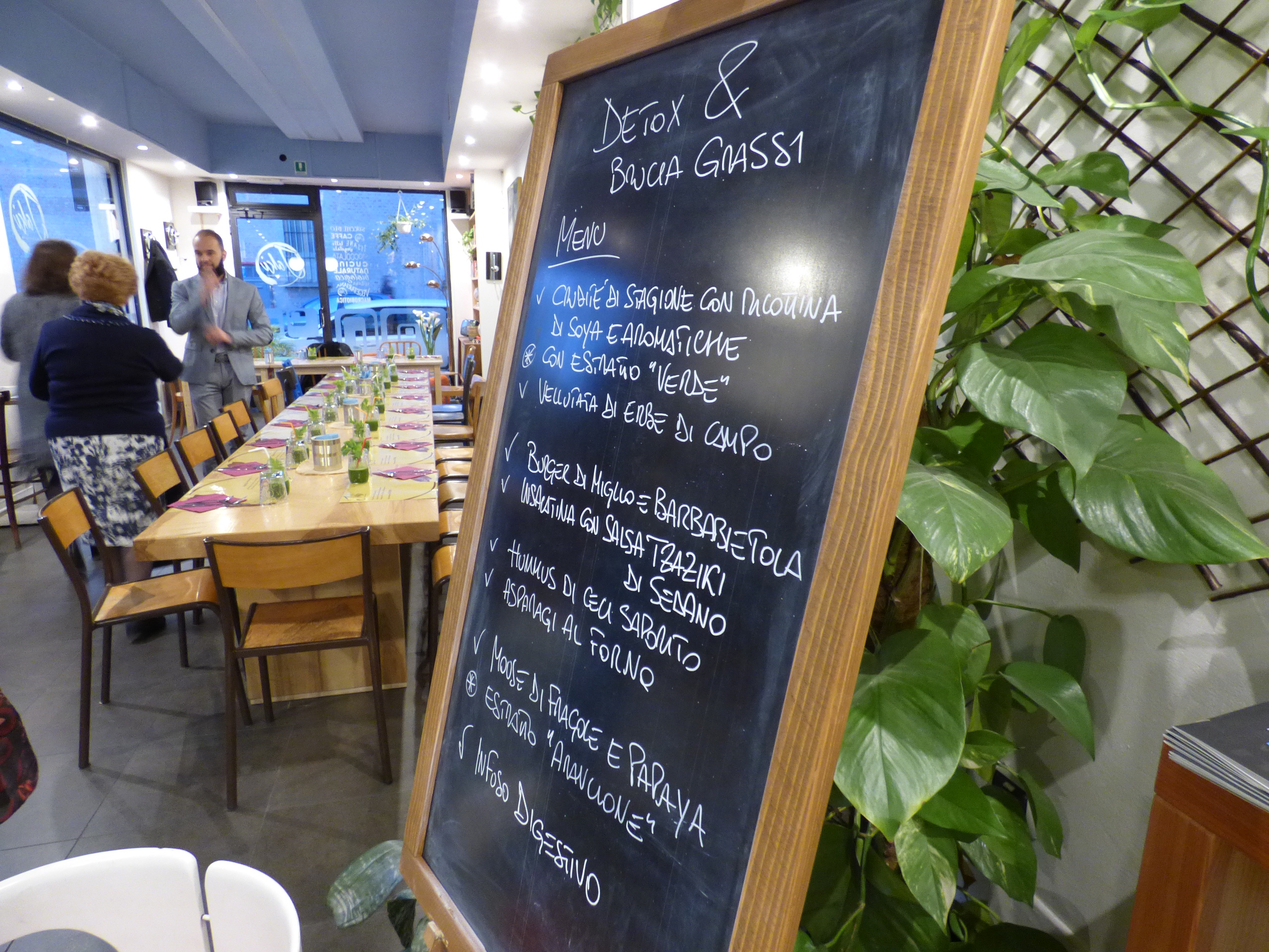 Un menu leggero, naturale e policromo è stato cucinato e servito dalla cuoca Chiara Ceci durante la serata “Detox e Brucia Grassi” del ciclo Salute & Benessere che si è tenuta nei giorni scorsi da JAKI – Cafè & Cucina Naturale – a Parma: cruditè di stagione con ricottina di soya e aromatiche, vellutata di erbe di campo con ortica e tarassaco, burgher di miglio e barbabietole rosse, insalatina con salsa tzatziki di sedano, hummus di ceci saporito e asparagi al forno; infine mousse di fragole e papaya, il tutto accompagnato da estratti di frutta e verdura e una tisana finale.
