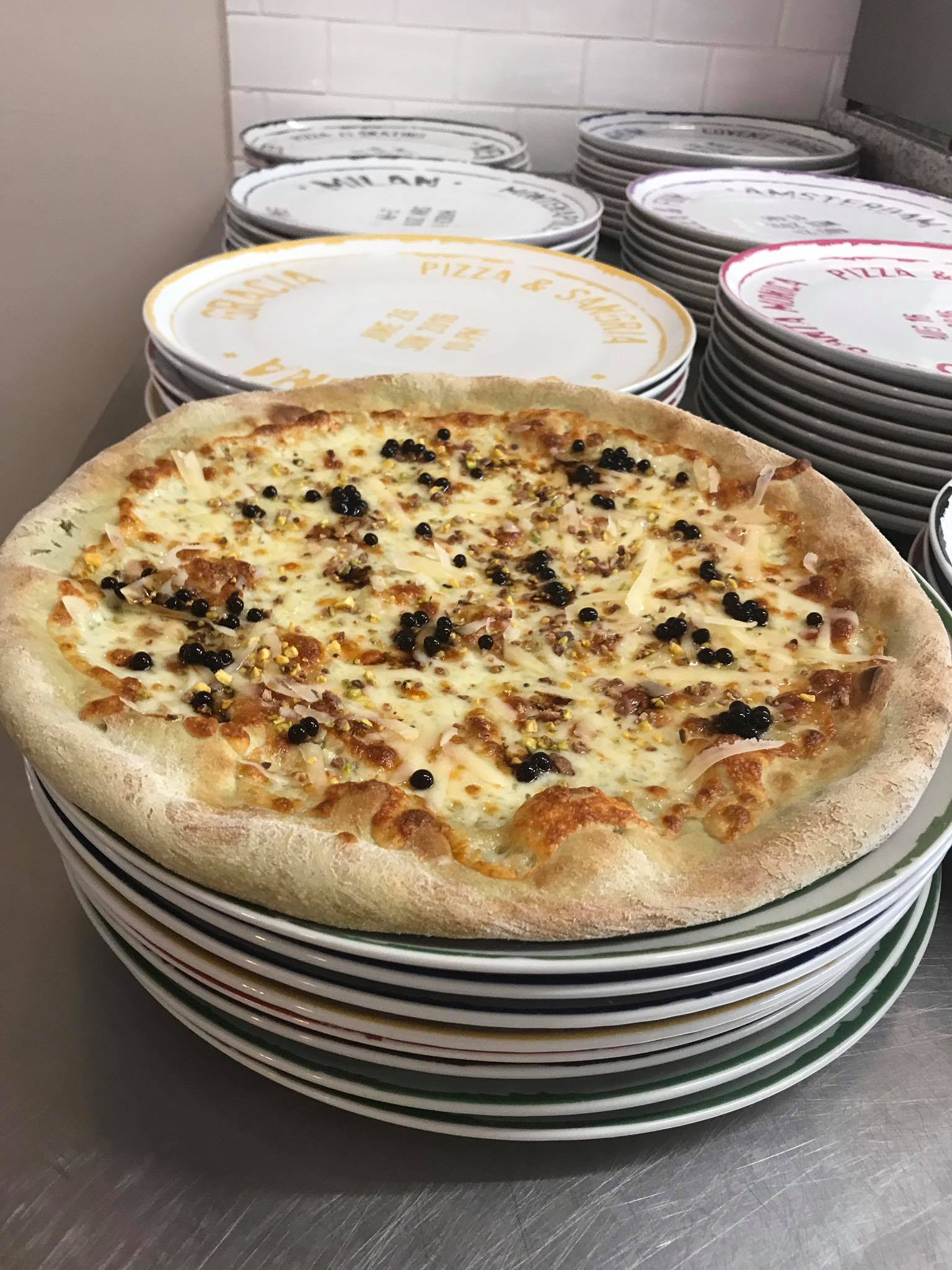 Pizza con impasto al pistacchio, farcita con Parmigiano, granella di pistacchio e sfere di aceto balsamico