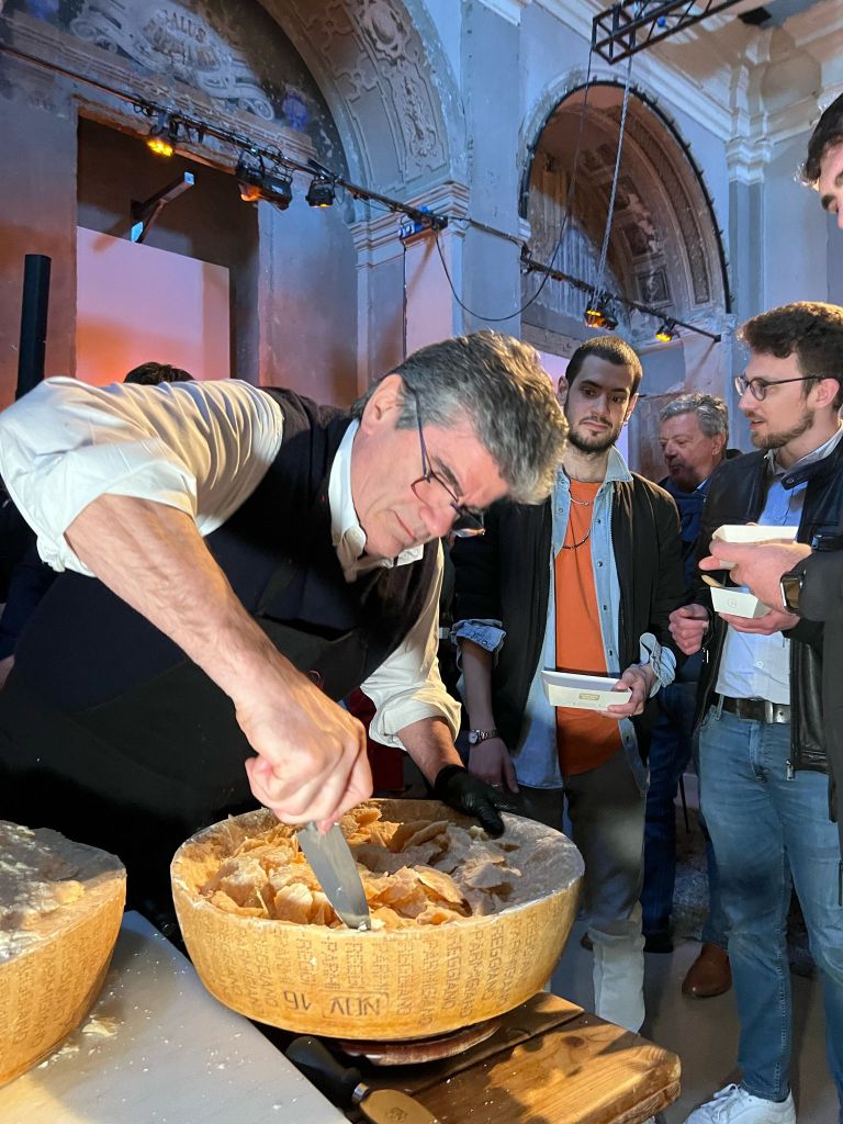 Dopo il video che ha documentato tutte le fasi di lavorazione fino alla posa, non poteva mancare l’apertura di ben tre forme di Parmigiano Reggiano, selezionate e curate dal maestro Silvano Romani, in tre stagionature: 24, 36 e 100 mesi.