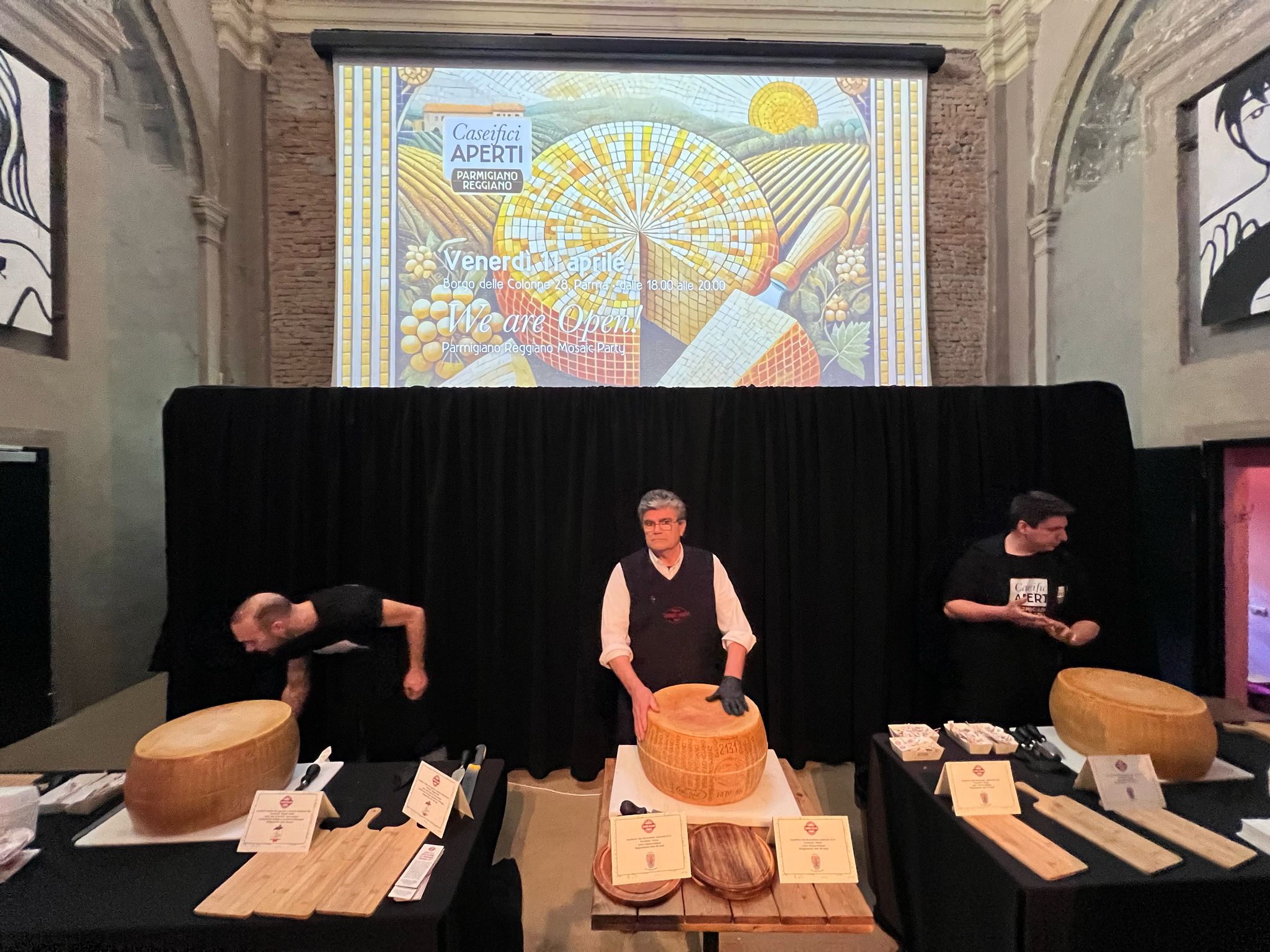 Dopo il video che ha documentato tutte le fasi di lavorazione fino alla posa, non poteva mancare l’apertura di ben tre forme di Parmigiano Reggiano, selezionate e curate dal maestro Silvano Romani, in tre stagionature: 24, 36 e 100 mesi.
