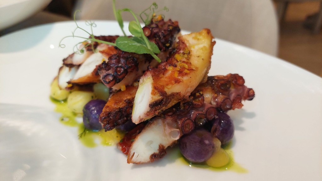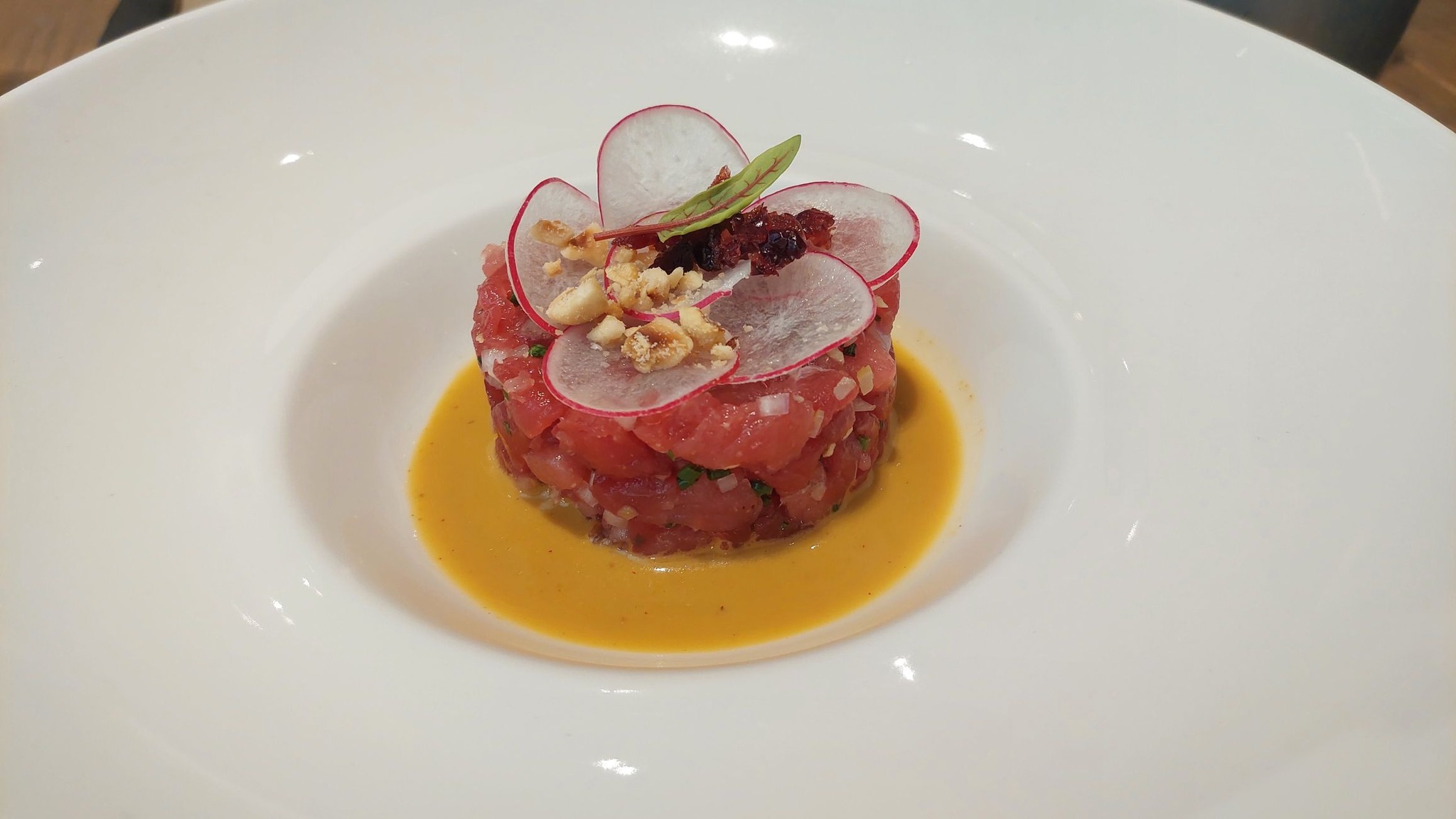 Il menù degustazione è un vero e proprio omaggio alla Toscana, con la Pappa al Pomodoro su crostone toscano, il polipo con patate viola caramellate, la tartare di tonno con salsa al mandarino, il carpaccio di Fassona con funghi, Parmigiano e rucola e il carpaccio di rape rosse con formaggio caprino e fichi, pistacchio e cipolle caramellate come antipasti.