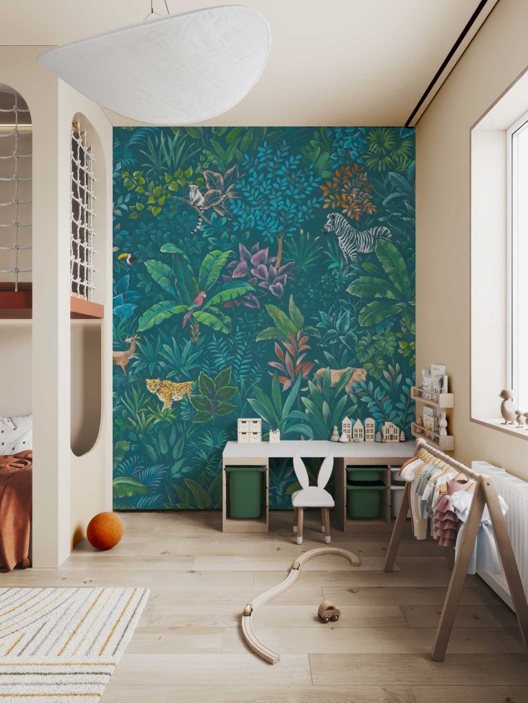 Inizia, così, un sorprendente viaggio tra natura e fantasia: dai pini marittimi di Campeggio Toscano alla giungla vibrante di Guyana, dal giardino incantato di Stranger Trees, dove frutteti, cactus e sempreverdi convivono in armonia, alle scene allegre e movimentate di Trova le arance, dove Gina la giraffa, Coco il coccodrillo e Leo la lepre guidano i bambini in una giocosa avventura, una simpatica ‘caccia al tesoro a parete’ per ritrovare le arance della scimmietta Betta, trasformando la carta da parati in un racconto da vivere ogni giorno.