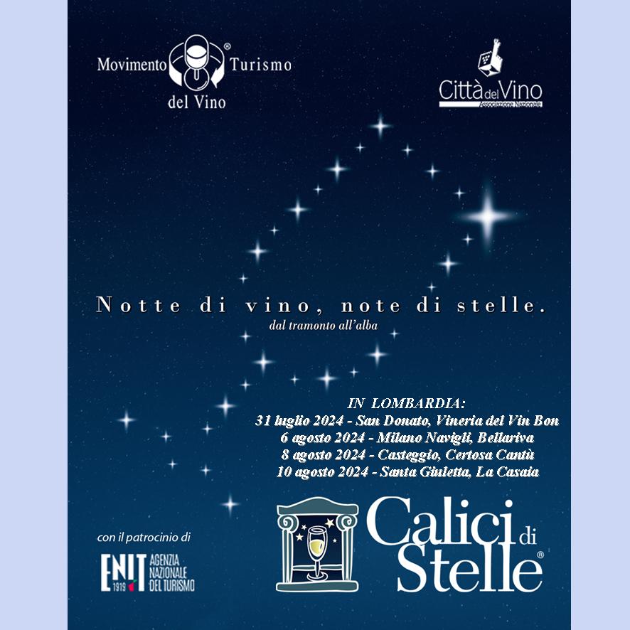 Quelle del 31 luglio, 6, 8, 10 agosto saranno quattro notti magiche d’estate dedicate ai vini di Lombardia, proposte dal Movimento Turismo del Vino per l’edizione 2024 di “Calici di Stelle”.